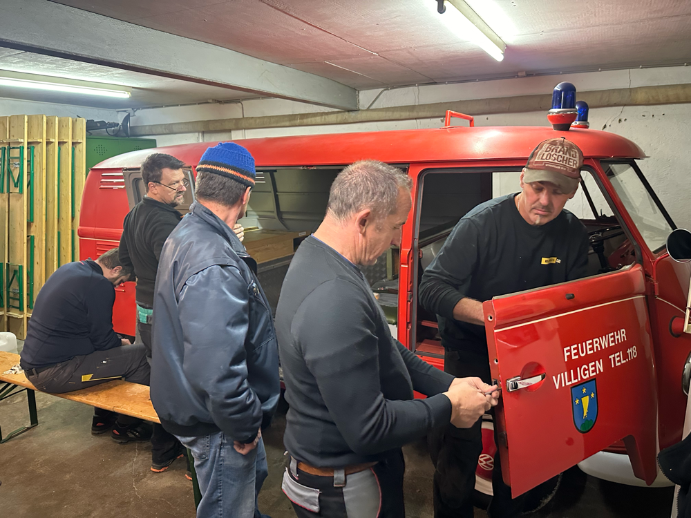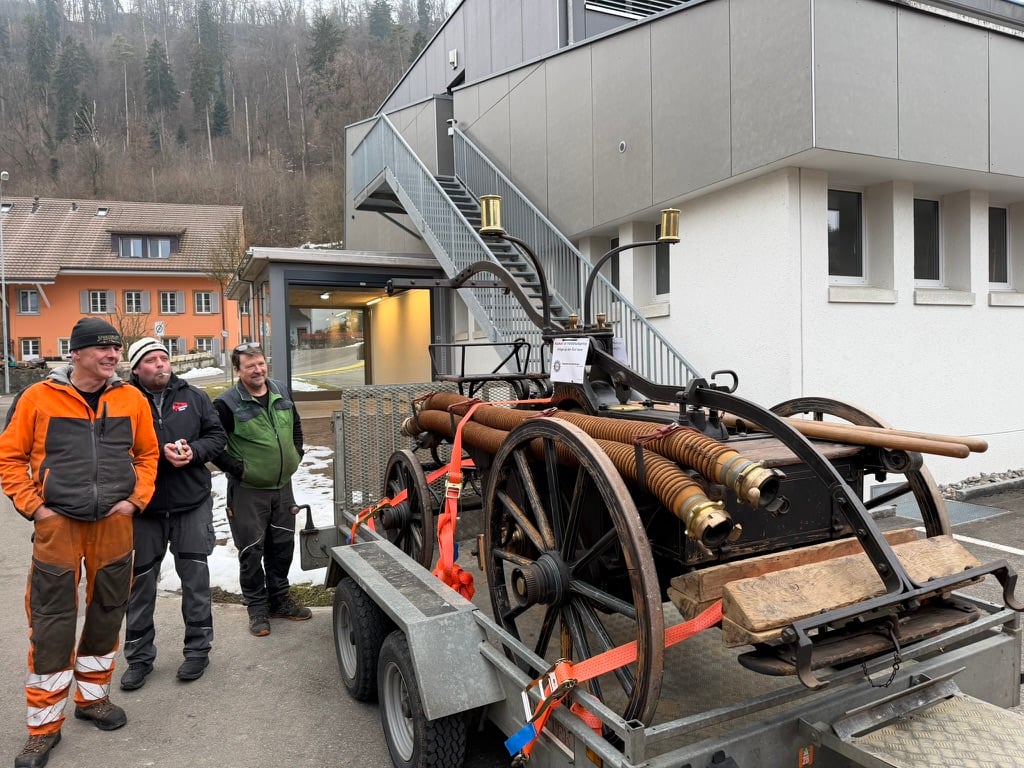 Nun ist sie zurück: Am 24.01.2026 brachte eine Delegation des Feuerwehrvereins Würenlingen das gute Stück persönlich zurück nach Villigen. Im neu erstellten Anbau neben dem Feuerwehrmagazin in Villigen hat die Spritze nun ihren festen Platz gefunden und darf bestaunt werden.